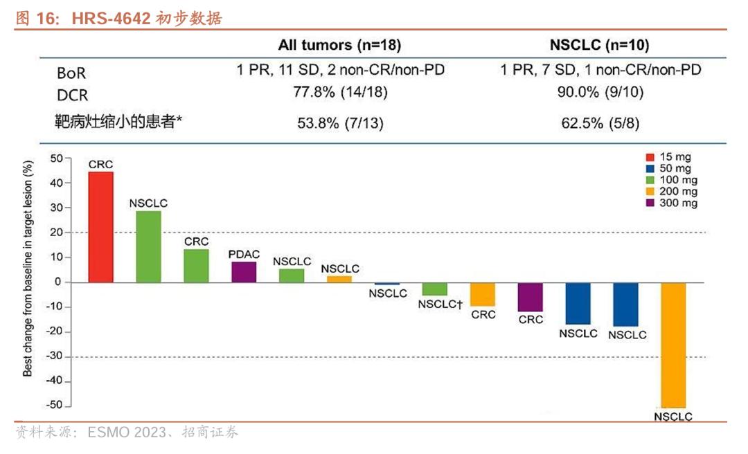 As early as 2023, HRS-4642 preliminary data was published by ESMO. The study included 18 patients (including 10 lung adenocarcinoma patients, 5 colorectal cancer patients, etc., median number of treatment lines was 3, Q2W). Among the 18 patients, 11 patients (61.1%) were in stable condition and 6 patients (33.3%) had target lesions reduced.