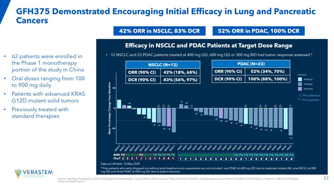 The latest GFH375/VS-7375 study data presented at the 2025 ASCO Congress (involving 75% of patients with advanced KRAS G12D-mutated solid tumors who had received two or more prior treatments) showed remarkable outcomes: Among 23 evaluable pancreatic ductal adenocarcinoma (PDAC) patients, the objective response rate (ORR) reached 52%, with a disease control rate (DCR) of 100%—indicating complete control or improvement in all treated pancreatic cancer cases. In a separate cohort of 12 non-small cell lung cancer patients, the ORR was 42% and DCR reached 83% (both groups received treatment with 400mg QD, 600mg QD, or 300mgBID regimens).
