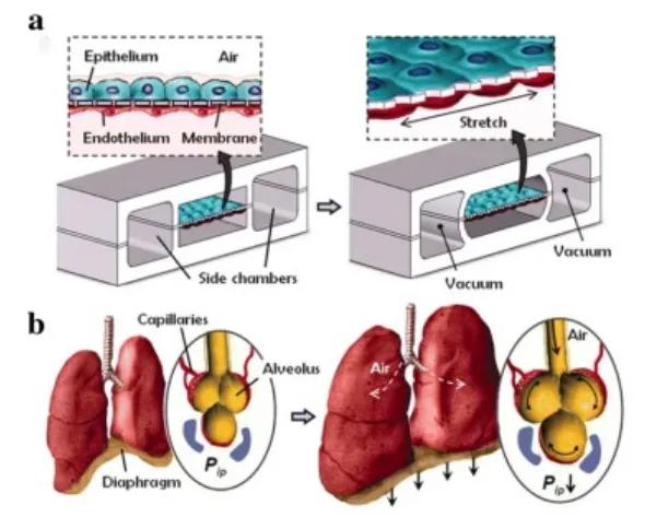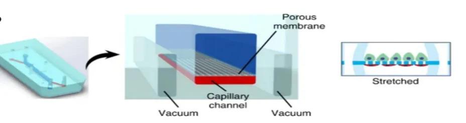 Gas exchange in the human lungs is regulated by the alveoli, small pockets that allow blood to exchange oxygen and carbon dioxide during respiration. This process has been challenging to replicate in vitro. However, OOC technology enables researchers to create precise lung microenvironments to maintain consistent gas exchange. The current study has mainly focused on the regulation of mechanical airway pressure and the blood – brain barrier. Some investigators have constructed a subregional lung microenvironment, as shown in Figure 2. The upper parts are alveolar cells and the lower parts are lung cells; this simulates the alveolar-capillary barrier. The system operates in a vacuum to simulate the expansion and contraction of the alveoli during respiration. Inflammatory stimuli are also introduced into the system in the form of neutrophils via fluid channels.