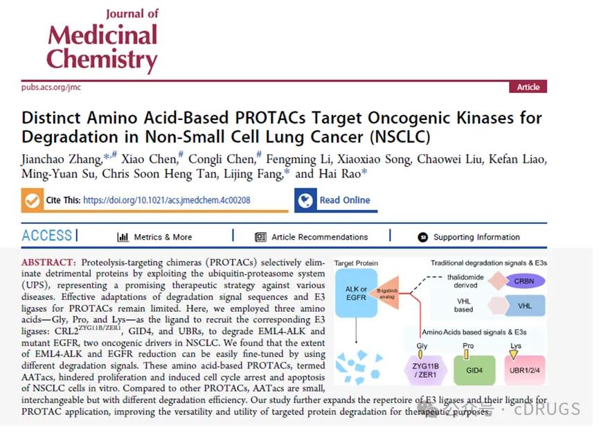 以PROTACs为代表的靶向蛋白质降解技术已经成为了一种极具前景的药物研发新策略,目前已有超过30种候选药物处于临床试验阶段。尽管PROTACs已经实现了对多种致病靶标的降解,但用于构建蛋白质降解技术的降解信号以及E3连接酶类型仍然是有限的。目前,只有VHL和CRBN两种E3连接酶被广泛应用到PROTACs的设计。因此,现阶段迫切需要探索其它蛋白质降解信号用于构建新型蛋白质降解技术。2024年8月8日,南方科技大学饶海教授团队在Journal of Medicinal Chemistry上发表了题为“Distinct Amino Acid-Based PROTACs Target Oncogenic Kinases for Degradation in Non-Small Cell Lung Cancer (NSCLC)”的论文。该研究基于三种能够触发N-末端降解途径的氨基酸(脯氨酸、甘氨酸和赖氨酸)开发了一种新型的PROTACs(也称为AATacs),并且利用AATacs在非小细胞肺癌中成功降解了两种致癌蛋白激酶EML4-ALK和EGFR-L858R/T790M。