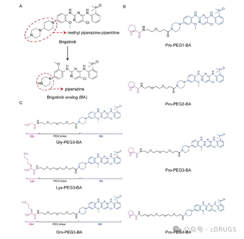 N-末端蛋白质降解途径是上世纪80年代发现的一种由泛素介导的蛋白质降解途径,早期的研究确立了位于N-末端的精氨酸和组氨酸等多种氨基酸能够被UBR家族E3连接酶识别,被认为是N-末端蛋白质降解途径的主要信号。最近的一些研究证实了甘氨酸和脯氨酸也可作为N-末端途径的降解信号,其分别能够被CRL2家族的E3连接酶ZYG11B或ZER1以及GID4识别介导蛋白质的降解。因此,为了构建基于N-末端途径的AATacs,作者以Brigatinib为靶蛋白配体,甘氨酸、脯氨酸以及赖氨酸为N-末端蛋白质降解信号,设计了一类靶向降解ALK和EGFR的AATacs。作者首先以脯氨酸为N-末端蛋白质降解信号,探究了合适的Linker长度,结果发现以4个PEG单元为Linker的Pro-PEG3-BA降解效率最优。随后作者固定优势Linker,将脯氨酸替换为甘氨酸和赖氨酸作为N-末端降解信号,设计了一系列AATacs。此外,作者还将脯氨酸替换为无法触发N-末端降解信号的鸟氨酸设计了Orn-PEG3-BA作为阴性对照(图1)。