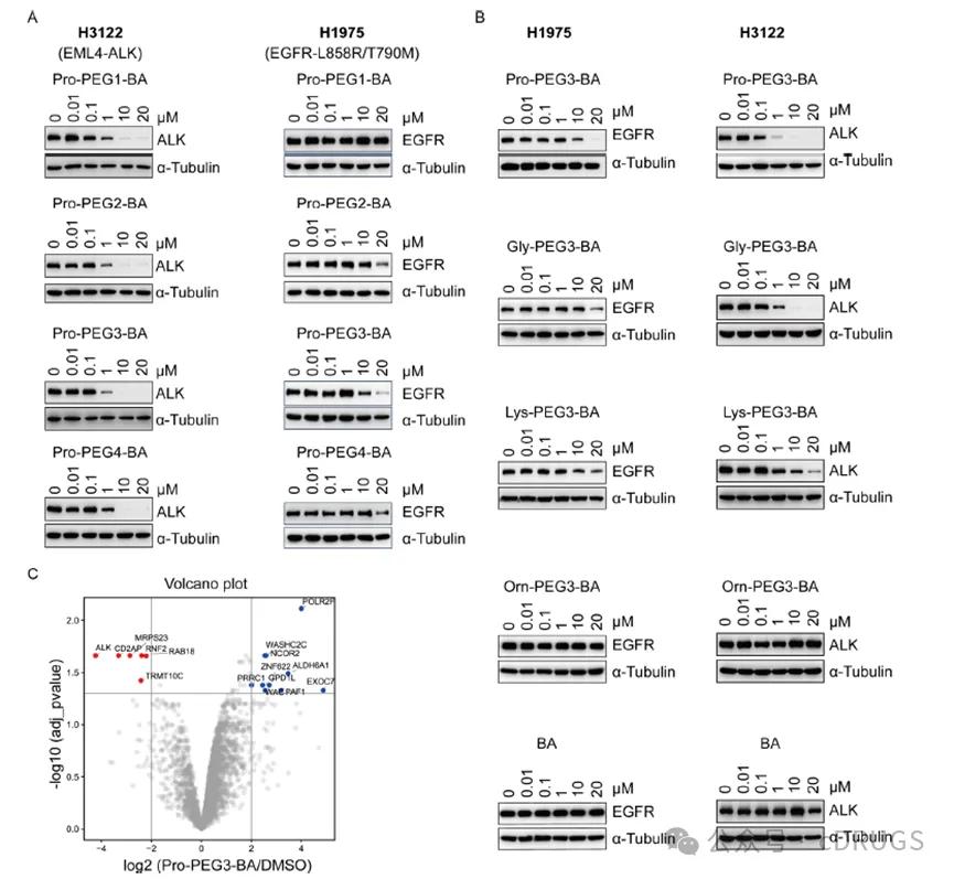 随后,作者探究了基于脯氨酸构建的包含不同PEG的AATacs的降解效率,结果发现在大于1 μM浓度条件下,四个化合物都能在H3122细胞中诱导明显的EML4-ALK降解。此外,这类化合物还能在H1975细胞中实现对EGFR L858R/T790M的降解。综合比较,Pro-PEG3-BA的降解效率相对较高(图2A)。通过将脯氨酸替换为赖氨酸和甘氨酸的Lys-PEG3-BA和Gly-PEG3-BA在H3122细胞中也能不同程度地诱导EML4-ALK降解,而阴性对照Orn-PEG3-BA处理组未观察到明显的EML4-ALK降解(图2B)。作者还通过全蛋白质组学分析探究了Pro-PEG3-BA的降解谱,结果显示ALK水平是经Pro-PEG3-BA处理后H3122细胞下降最明显的蛋白质,这证明了Pro-PEG3-BA具有较好的选择性(图2C)。