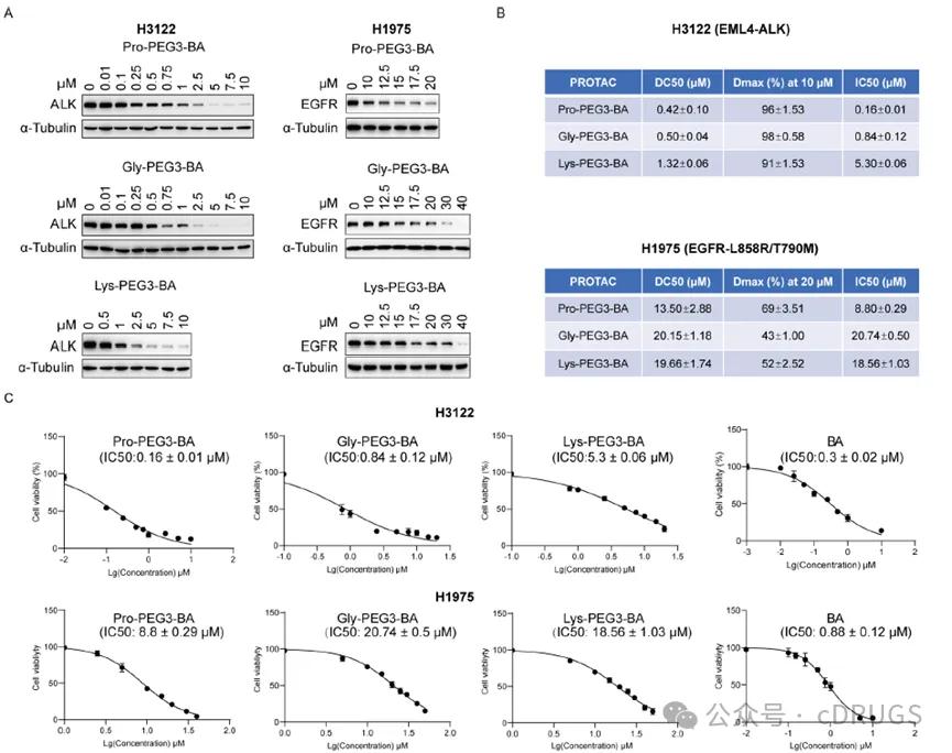 接下来,作者进一步评估了基于三种氨基酸构建的AATacs对EML4-ALK和EGFRL858R/T790M的DC50和Dmax,结果显示Pro-PEG3-BA,Lys-PEG3-BA和Gly-PEG3-BA在H3122细胞中的DC50在0.42-1.32 μM之间,Dmax都能够达到90%以上(图3A和3B)。三个化合物对EGFRL858R/T790M的降解效果相对较差,DC50在13.5-20.2 μM之间,Dmax在43-69%之间(图3A和3B)。此外,作者通过CCK-8还评估了三个化合物对H3122和H1975细胞的增值抑制效果。结果显示三个化合物对H3122细胞的IC50在0.16-5.30 μM之间,对H1975细胞的IC50在8.80-20.74 μM之间(图3C)。
