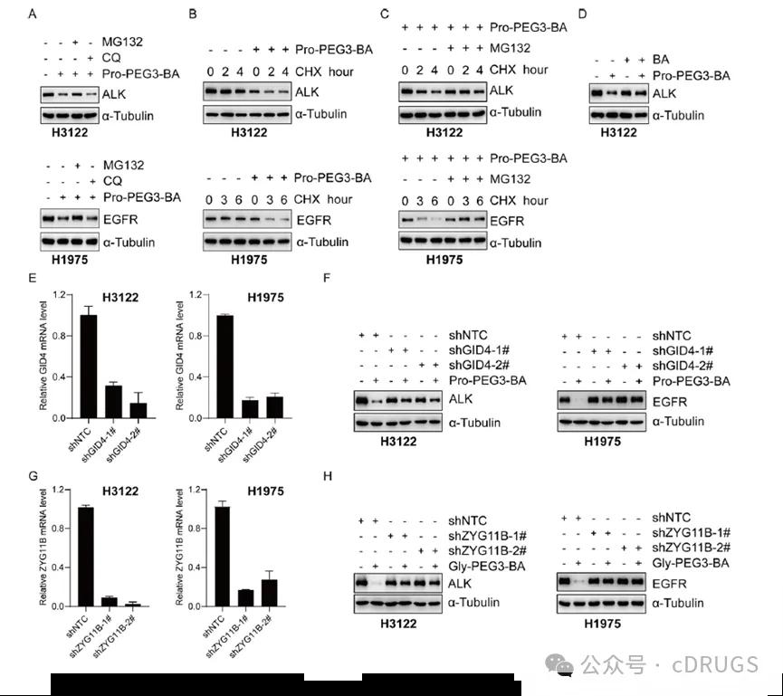 为了进一步探究AATAcs诱导EML4-ALK和EGFRL858R/T790M降解的作用机制,作者分别在蛋白酶体抑制剂MG132和溶酶体抑制剂氯喹处理的H3122和H1975探究了Pro-PEG3-BA的降解效率。可以发现MG132可以部分抑制Pro-PEG3-BA对EML4-ALK和EGFRL858R/T790M的降解,这说明ATTacs诱导蛋白质降解是基于蛋白酶体的功能实现的(图4A)。此外,在经Cycloheximide处理的细胞中,Pro-PEG3-BA能够更加快速地导致EML4-ALK和EGFRL858R/T790M水平降低(图4B)。进一步加入MG132能够抑制对EML4-ALK和EGFRL858R/T790M的周转,延长其半衰期(图4C)。加入靶蛋白配体Brigatinib会导致Pro-PEG3-BA对EML4-ALK的降解受到抑制(图4D)。这些结果表明Pro-PEG3-BA诱导了靶蛋白的降解。随后,为了证明AATacs诱导蛋白质降解是否是通过N-末端降解途径实现的,作者构建了GID4敲除的H3122和H1975细胞。可以发现GID4敲除后,Pro-PEG3-BA对EML4-ALK和EGFRL858R/T790M的降解能力丧失(图4E和4F)。同理,在ZYG11B敲除的细胞中,Gly-PEG3-BA的降解能力明显降低(图4G和4H)。最后,作者还评估了Pro-PEG3-BA对细胞周期和凋亡的影响,结果表明Pro-PEG3-BA能够以浓度依赖的方式诱导H3122和H1975细胞阻滞在G1期,并显著增加了早期和晚期凋亡细胞的比例。