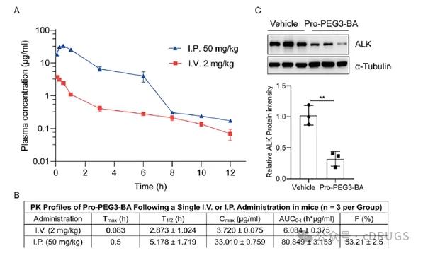 最后,作者还在小鼠模型中评估了Pro-PEG3-BA的PK属性,结果显示20 mg/kg静脉给药后,半衰期(T1/2)为2.9小时,最大血药浓度(Cmax)为3.7 μg/mL,曲线下面积(AUC)为6.0 h*μg/mL;50 mg/kg腹腔注射给药后,半衰期(T1/2)为5.2小时,最大血药浓度(Cmax)为33 μg/mL,曲线下面积(AUC)为81 h*μg/mL,生物利用度为53.2%(图5A和5B)。在H132异种移植模型中的PD实验显示腹腔注射给药10 mg/kg的条件下,24 h后Pro-PEG3-BA就能够显著降低肿瘤组织中ALK蛋白的水平(图5C)。