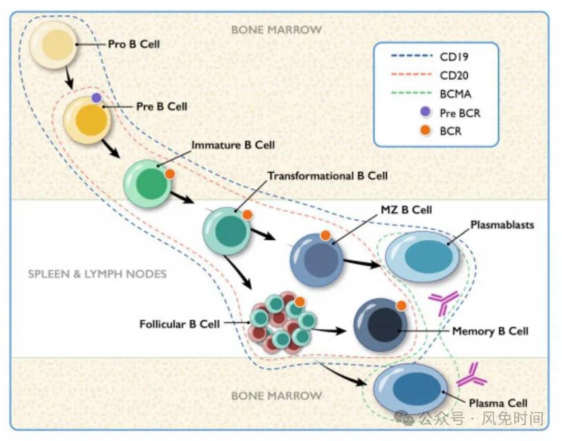 CD20是B细胞清除疗法的主要靶标抗原,其在从pre-B细胞到记忆B细胞的广泛B细胞谱系中表达,但在浆母细胞和浆细胞中不表达。