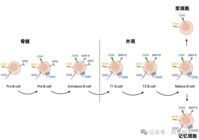 B细胞成熟不同阶段所表达的表面标志物,包括CD19、CD20、CD22、CD40等