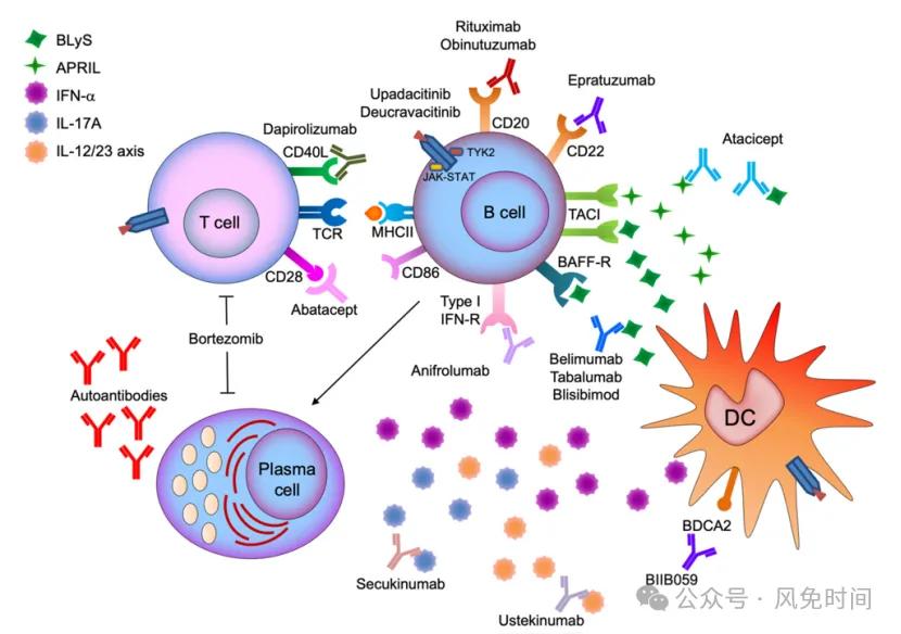 抗B细胞活化因子(BAFF)的贝利尤单抗(3期达到终点 降低疾病活动度及激素剂量)、tabalumab(3期未达到终点)等;