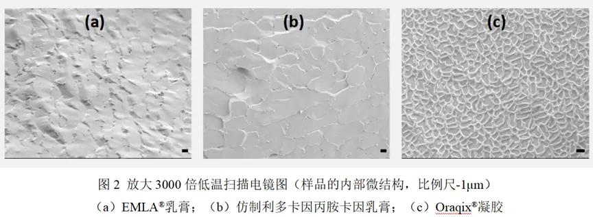 •乳膏显微镜图像显示乳滴粒径直径为1-3μm,而Oraqix®凝胶是均匀无乳滴的体系。在低温扫描电子显微镜(cryo-SEM)下,乳膏表现出与凝胶不同的微观结构(图2)。