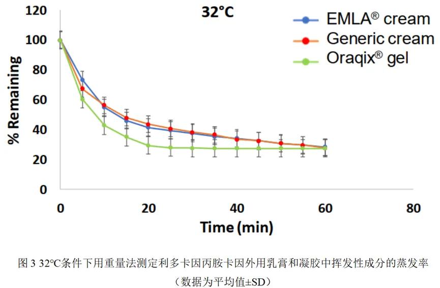 结果:参比制剂和仿制利多卡因/丙胺卡因外用乳膏的Q3特性彼此相似,而与乳膏产品相比,Oraqix®凝胶的pH值较低,蒸发率较高、屈服应力较低且无乳滴。IVPT研究结果表明,参比制剂与仿制乳膏之间的利多卡因和丙胺卡因的皮肤PK相当。与EMLA®乳膏相比,Oraqix®凝胶中利多卡因和丙胺卡因的最大通量(Jmax)和曲线下面积(AUC)较低,并且发现凝胶和乳膏生物不等效。使用dOFM在健康受试者中进行的体内皮肤PK研究结果与体外(IVPT)结果一致。