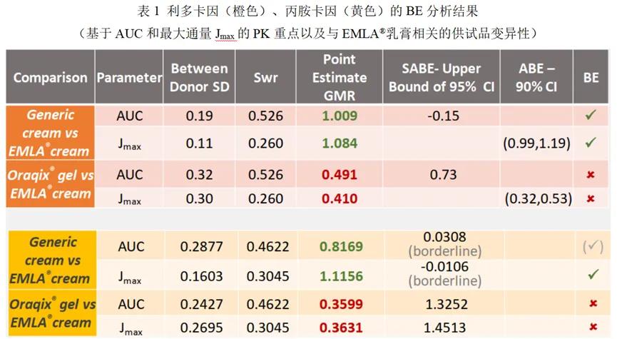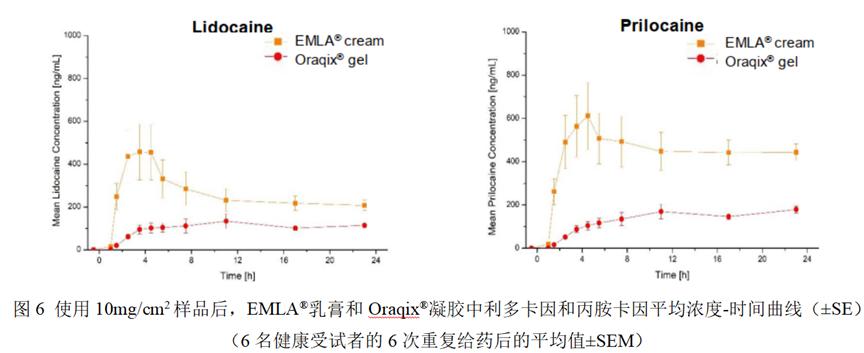 方法:本研究评估的产品包括(1)参比制剂EMLA®(利多可因:丙胺卡因)乳膏(2.5%:2.5%);(2)EMLA®乳膏仿制药;(3)Oraqix®(利多卡因:丙胺卡因)凝胶(2.5%:2.5%)复方制剂,规格与利多卡因/丙胺卡因乳膏相同。评估了三种药品的Q3特性对比。通过体外渗透试验(IVPT)比较了凝胶和乳膏中利多卡因和丙胺卡因的皮肤药代动力学(PK)。根据利多卡因和丙胺卡因的的皮肤PK终点,评估了乳膏仿制药、Oraqix®凝胶和EMLA®乳膏的BE。还在体内研究中使用真皮开放流微灌注(dOFM)在6名健康受试者中比较了EMLA®和Oraqix®的皮肤生物利用度。