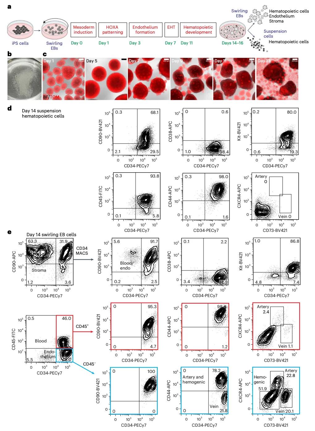 在这里,我们建立了一种诱导多能干细胞(iPSC)分化的实验方案,生成了具有多谱系造血植入(MLE)能力的CD34+造血干细胞,研究团队将其称为iPS细胞来源的造血干细胞(iHSC),该方案的关键要素包括定义的培养基和对CD34+细胞的冷冻保存,以适应未来的临床应用。
