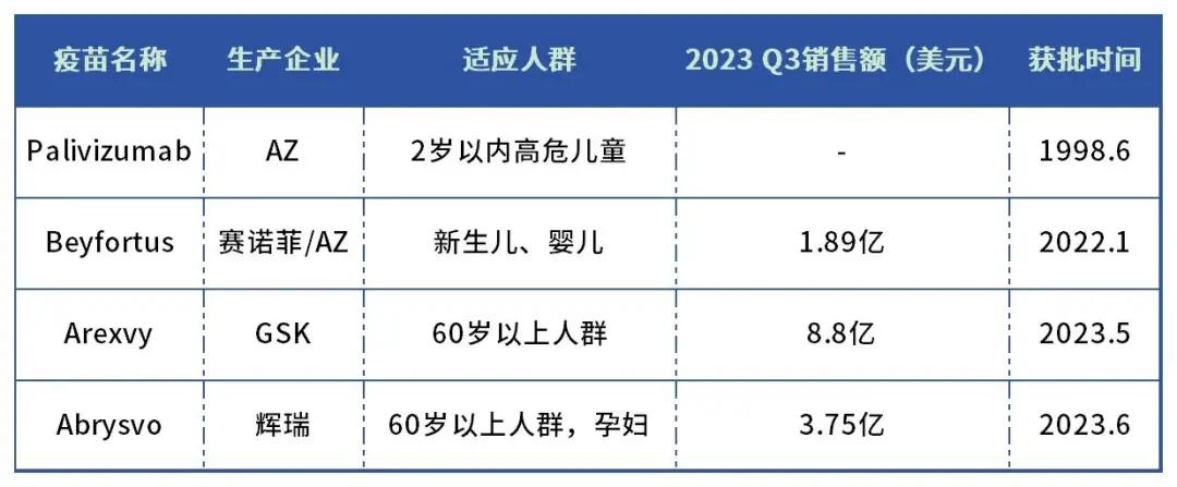 在百亿蓝海市场里,全球获批RSV相关适应症的主要有四款药物,分别是AZ的帕利珠单抗(Palivizumab)、赛诺菲/AZ的长效单克隆抗体Beyfortus、GSK的RSV疫苗Arexvy和辉瑞的RSV疫苗Abrysvo。