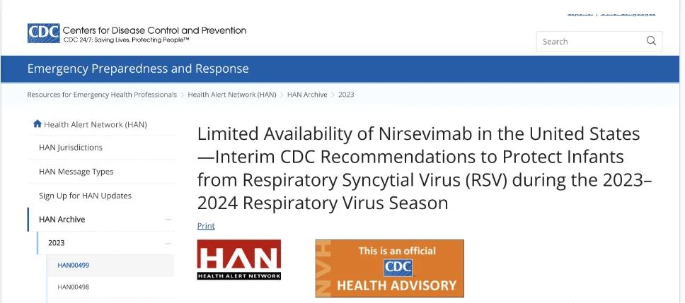 10月23 日,CDC提醒医疗保健提供者Beyfortus供应短缺,并建议为RSV并发症风险最高的婴儿优先使用,包括6月龄或以下的婴儿,以及患有心脏和肺部疾病的人。