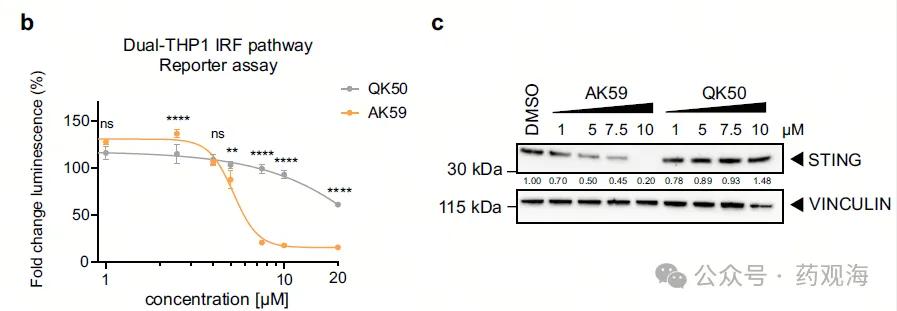 图1b展示了AK59对STING通路的抑制活性,图1c则显示了AK59能够剂量依赖性地降低STING蛋白水平。为了进一步验证AK59的作用机制,研究人员进行了一系列实验,包括蛋白组学分析、CRISPR-Cas9基因敲除筛选以及免疫共沉淀等。