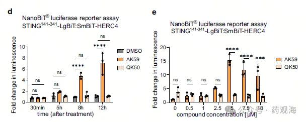 免疫共沉淀实验表明,AK59能够诱导STING蛋白与一种名为HERC4的E3泛素连接酶“拉”到一起,形成一个复合物(图5c)。NanoBiT®互补实验进一步证实了AK59诱导的STING-HERC4相互作用,并排除了CGAMP竞争结合的可能性(图5d, 5e)。
