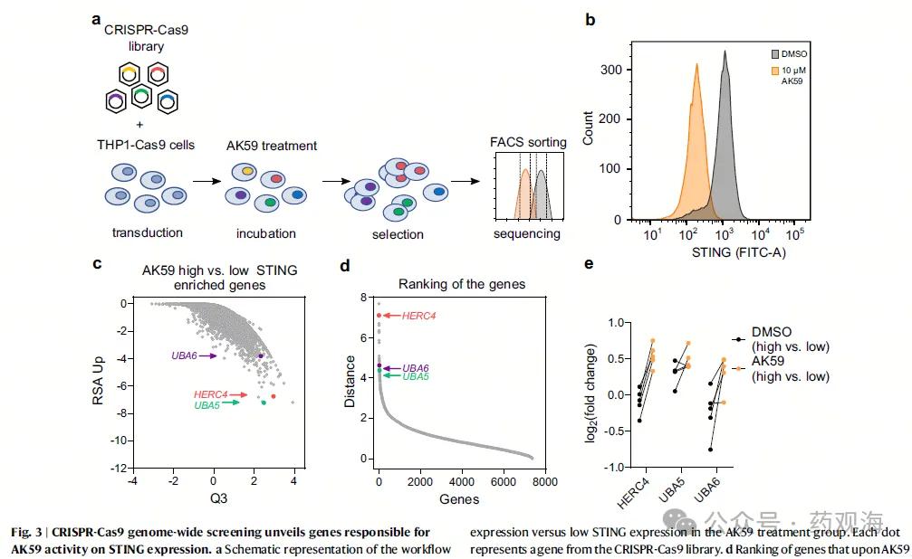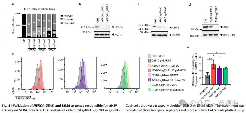 CRISPR-Cas9基因敲除筛选则鉴定了AK59依赖的STING降解相关基因,其中包括HERC4、UBA5和UBA6(图3)。进一步的实验验证了这些基因在AK59介导的STING降解中的作用(图4)。