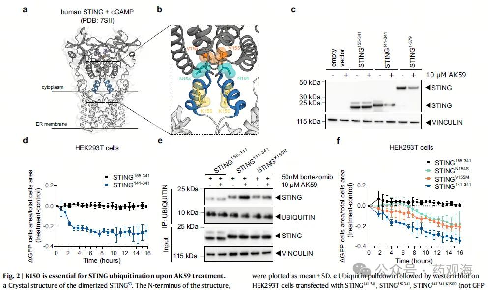 为了更好地理解AK59的作用机制,我们需要了解STING蛋白的结构。图2a展示了STING蛋白的晶体结构,其中包含跨膜结构域、连接子螺旋和配体结合结构域。研究发现,连接子螺旋上的K150位点对于AK59介导的STING泛素化和降解至关重要(图2b, 2e)。此外,AK59也能够降解常见的SAVI突变体STING蛋白(图2f)。