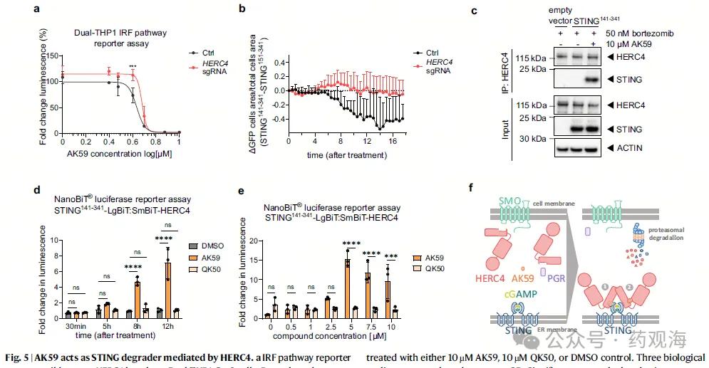 图5f总结了AK59的作用机制:AK59通过诱导STING与HERC4的相互作用,促使STING蛋白被泛素化并最终被蛋白酶体降解。