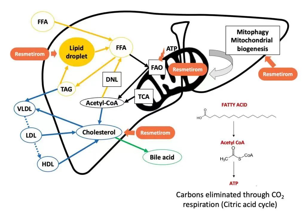 Resmetirom是一种靶向肝脏的甲状腺激素受体 β(THR-β)口服选择性激动剂。在MASH中,肝脏中的甲状腺激素β活性受损,导致线粒体功能降低和脂肪酸的β氧化,进而导致炎症和肝纤维化,Resmetirom旨在靶向这一基础病因。