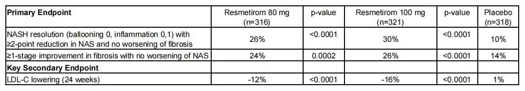 2023年12月,Madrigal曾宣布Resmetirom治疗MASH的III期MAESTRO研究达到了双重主要终点。III期临床试验数据显示,相较于安慰剂组,服用两种剂量的Resmetirom药物的患者均达到两项终点:患者拥有更高的症状缓解水平和肝脏纤维化改善水平,达到非酒精性脂肪性肝病活动评分(NAS)下降的主要终点,同时也实现了低密度脂蛋白胆固醇水平(LDL)下降,达到关键次要终点。