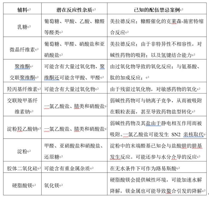 除了辅料本身可能与原料发生的反应外,辅料里的杂质也可能与药物发生化学相互作用。表2列举了各种辅料中可能存在的反应性杂质和已知的不相容性案例。