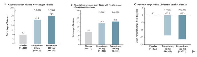 Rezdiffra的加速批准是基于最近发表在《新英格兰医学杂志》上的MAESTRO-NASH三期临床试验结果。该项临床试验用于评估MGL-3196对NASH和纤维化患者疗效和安全性,共招募了1759名NASH患者,经过52周的治疗,100毫克和80毫克剂量的Rezdiffra与安慰剂相比,在两个主要终点上都有统计学意义上的显著改善:NASH缓解且没有更进一步恶化的纤维化,且出现至少一个阶段的纤维化改善的患者比例相比于安慰剂组也均有明显提高,并均没有出现NASH恶化的情况。此外关键次要终点低密度脂蛋白含量(LDL-C)相比于安慰剂组出现明显降低。Rezdiffra可改善中晚期肝纤维化的NASH患者的肝纤维化并缓解NASH。