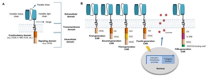 图1 CAR结构(第二代)与CAR五代技术更迭(参考9)