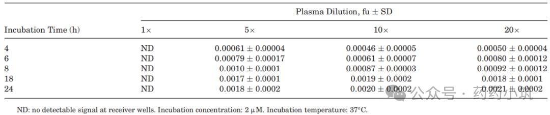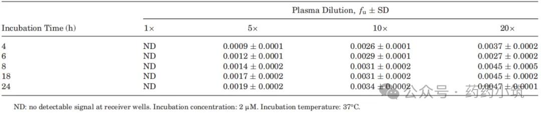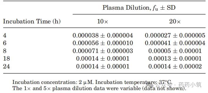 采用RED装置,研究评估了血浆稀释度与孵育时间对蛋白结合测定结果的影响(表1)。结果显示(表1):对于未稀释血浆,即使延长孵育时间至24小时,仍无法准确检测到游离分数(fu),其原因可能在于化合物与装置塑料壁或透析膜之间存在高度非特异性结合。而当采用5倍、10倍及20倍稀释血浆时,虽在孵育4小时后可检测到fu值,但体系并未达到完全平衡;进一步延长孵育时间至18小时及以上,fu值未出现显著的时间依赖性变化,表明18h体系已达到平衡状态。