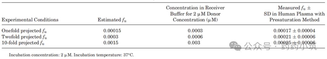 本研究以胺碘酮为模型化合物,探讨高结合药物PPB测定中的技术难点。实验采用HTD 96平衡透析装置(其接收池与膜表面积约为RED装置的1/4,有利于更快饱和非特异性结合位点)。结果显示,在未稀释或5倍稀释血浆中,胺碘酮的fu值变异较大;而使用10倍或20倍稀释血浆并孵育18–24小时后,fu值趋于稳定,平均为0.00014(表6),与红细胞分配法报道值0.0002相符(表3)。