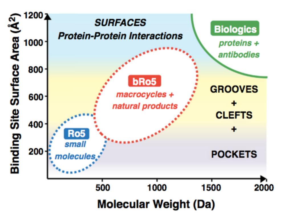 在药物化学的教科书里,有一个著名的里宾斯基五规则(Rule of 5),要求口服小分子需要有合适的分子量、氢键供受体、脂水分配等。它像一道诅咒,限制了口服药物的分子量和亲疏水性。长期以来,分子量处于 500–2000 Da 区间的多肽往往由于在溶液中表现出显著的构象柔性,导致靶点结合时承受较大的构象熵代价;同时,其分子尺寸和极性特征又限制了经肠上皮的被动吸收,使其在口服药物开发中长期处于小分子与大分子之间的灰色地带。