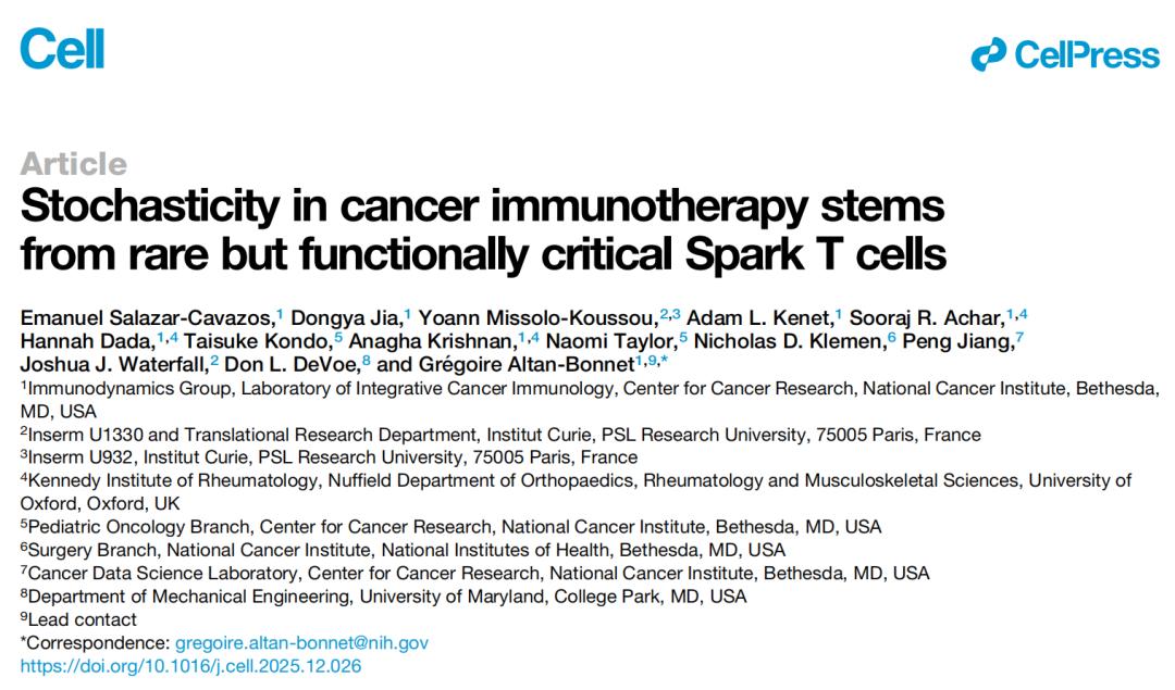 2026 年 2 月 5 日,美国国家癌症研究中心的研究人员在国际顶尖学术期刊 Cell 上发表了题为:Stochasticity in cancer immunotherapy stems from rare but functionally critical Spark T cells 的研究论文。