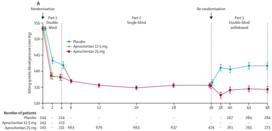 [3]Schlaich MP, et al. Dual endothelin antagonist aprocitentan for resistant hypertension (PRECISION): a multicentre, blinded, randomised, parallel-group, phase 3 trial. Lancet. 2023 Jan 28;401(10373):268