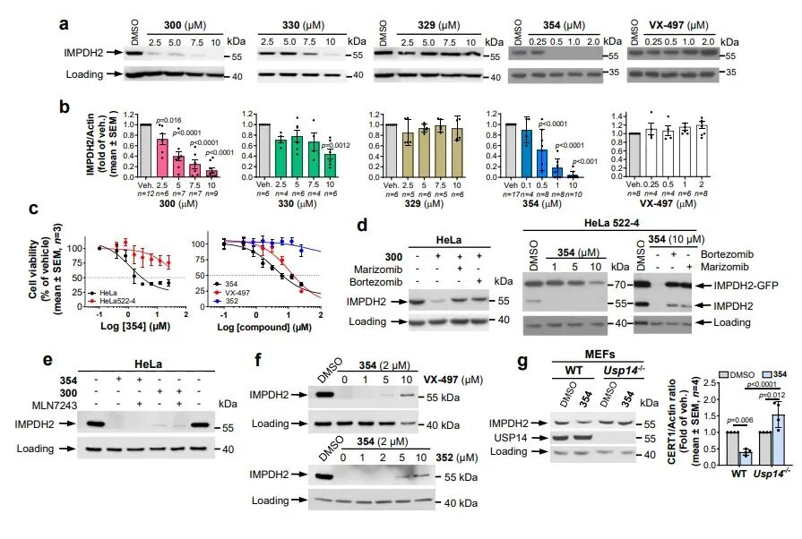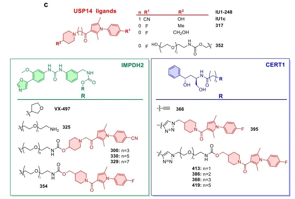 IMPDH2 是鸟嘌呤核苷酸从头合成的限速酶,在白血病、淋巴瘤及多种实体瘤中高表达,与肿瘤进展、化疗耐药密切相关,目前仅有极少数降解剂报道。研究人员以 IMPDH2 抑制剂 VX-497 为靶头,以 USP14 配体 IU1-248 及其衍生物为招募端,通过不同长度的 PEG 连接子构建了一系列嵌合体。细胞实验显示,优化后的分子354在500–1000 nM浓度下即可实现 IMPDH2 的完全清除,降解效果显著优于早期分子。机制研究证实:IMPDH2 的降解可被蛋白酶体抑制剂逆转,但不受泛素激活酶抑制剂 MLN7243 影响;在 USP14 敲除细胞中,降解作用完全消失。上述结果直接证明,26S-UIDs 以USP14 依赖、泛素非依赖、蛋白酶体依赖的方式实现靶蛋白清除。