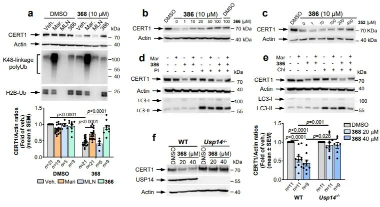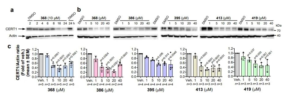CERT1 是神经酰胺转运蛋白,负责将神经酰胺从内质网转运至高尔基体合成鞘磷脂,其高表达会降低细胞内促凋亡神经酰胺水平,介导乳腺癌等肿瘤的化疗耐药,此前尚无针对 CERT1 的降解剂报道。本研究以 CERT1 的 HPA 家族拮抗剂为靶头,同样采用 USP14 配体 317 构建了 5 种 26S-UIDs。实验结果显示,最优分子368在16–24 小时内即可显著降解 CERT1,且降解机制与 IMPDH2 完全一致:依赖 26S 蛋白酶体、依赖 USP14、不依赖泛素化。脂质组学分析证实,CERT1 降解会导致细胞内C14–C20 链长的促凋亡神经酰胺显著累积,并可增敏 HER2 阳性乳腺癌细胞对拉帕替尼的敏感性,提示该策略在克服肿瘤耐药方面具有重要应用价值。