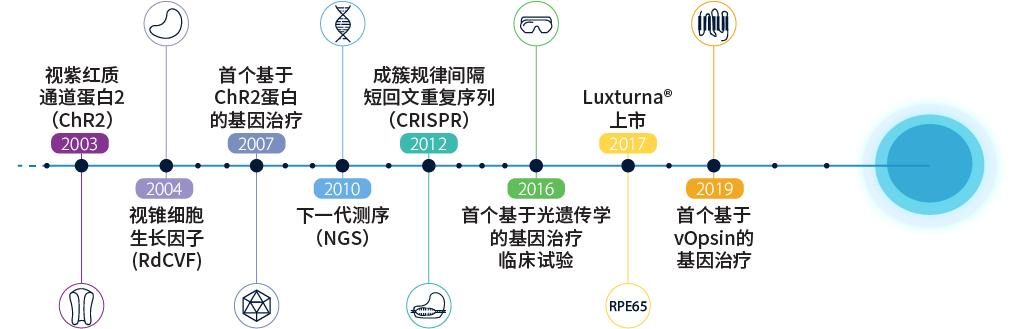 美国食品药品监督管理局(FDA)和欧洲药品管理局(EMA)在2017年和2018年之间批准了眼科的第一款基因治疗药物voretigene neparvovec(Luxturna®,Spark Therapeutics),用于治疗双拷贝RPE65基因突变导致的遗传性视网膜病疾病,RPE65基因负责编码将全反式视黄酯转化为11-顺式视黄醇的酶,这一过程是视网膜色素上皮内的视觉周期的一部分,当RPE65基因发生突变时,导致此类疾病会发展为法定失明,这也意味着基因治疗有可能会实现真正意义上的“重见光明”。