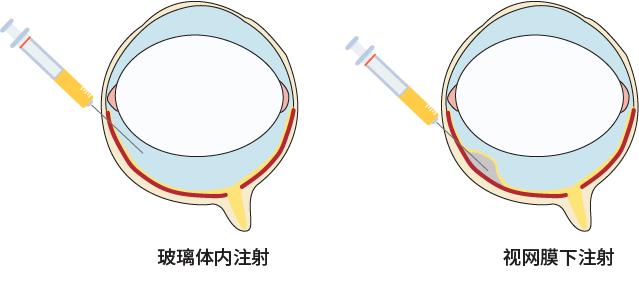 当治疗的靶细胞为神经节细胞和内核层细胞时,首选玻璃体注射;当治疗光感受器或视网膜色素上皮的细胞时,首选视网膜下注射,后者的优点是注射部位在血视网膜屏障之后,但缺点是更具侵入性风险,需要进行视网膜剥离,并易在注射部位形成视网膜下出血。[Hum Gene Ther. 2022; 33(17-18): 865-878.]
