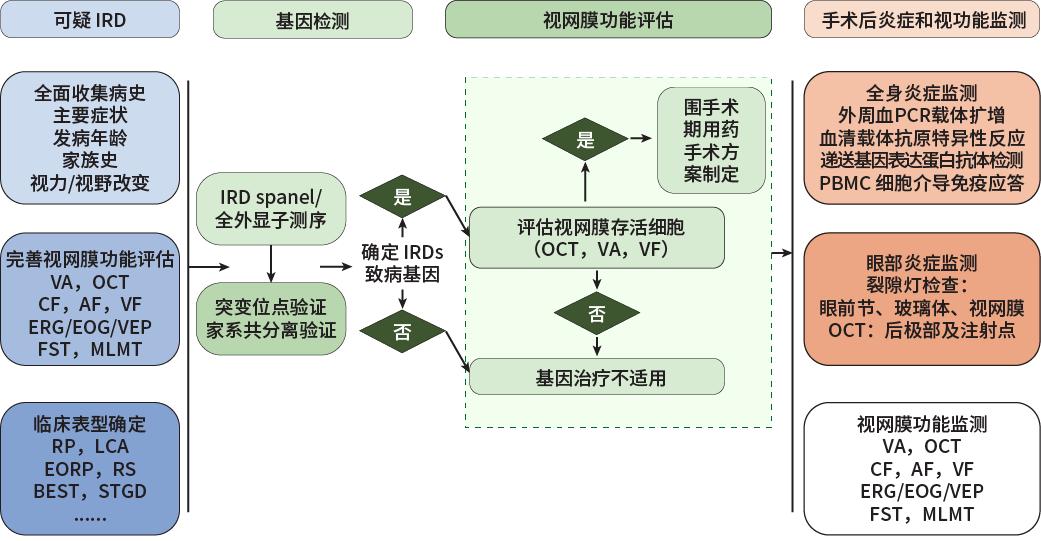 注:IRD:遗传性视网膜疾病;VA:视力;OCT:光相干断层扫描;CF:彩色眼底照相;AF:自身荧光;VF:视野;ERG:视网膜电图;EOG:眼电图;VEP:视觉诱发电位;FST:全视野光敏阈值测试;MLMT:多亮度移动性测试;RP:视网膜色素变性;LCA:Leber先天性黑矇;EORP:早发型RP;RS:先天性视网膜劈裂症;BEST:BEST卵黄样黄斑营养不良;STGD:青少年黄斑营养不良;PCR:聚合酶链反应;PBMC:外周血单核细胞。[中华眼底病杂志, 2022, 38(8): 636-642.]