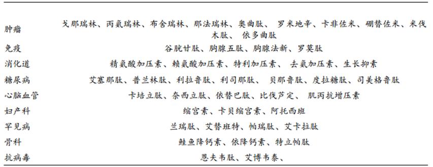 近年来,更高的获批率和更短的研发周期带动了多肽药物的研发热情,由于多肽药物适应证广、安全性高且疗效显著,已广泛应用于肿瘤、免疫类疾病的预防、诊断和治疗中,具有广阔的开发前景。目前全球获批的多肽类药物约180种,主要集中在抗肿瘤领域(30%),其次分别是消化道(14%)、糖尿病(13%)和罕见病领域(11%)。随着全球多肽药物市场飞速发展,2022年全球市场规模达729亿美元,预计2023年将达到795亿美元。