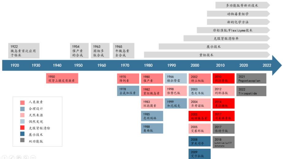 多肽药物发展历史悠久,自1902年首个多肽物质在人体内被发现,多肽研究至今已发展超过百年。1922年多肽(胰岛素)首次应用于人体,开启了多肽药物波澜壮阔的新篇章,1963年多肽固相合成技术(SPPS)的发明为多肽药物带来了里程碑式的革命,其合成方便、迅速、成为多肽合成的首选方法,催生了多肽药物的快速发展。70年代以后,人工合成多肽开始陆续运用于临床。随着多肽结构修饰与化学改造方法迭代,包括肽链骨架的改造,以及引入脂肪酸、聚乙二醇、蛋白融合等进行修饰优化,解决了多肽药物选择性差、易降解、半衰期短等问题。此外,叠加新靶点开发、新适应症拓展以及剂型优化,为多肽药物的市场空间带来新增量。