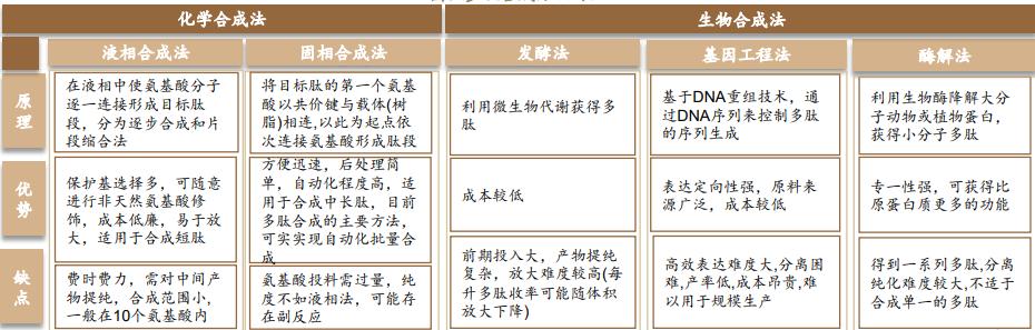 基因工程法是未来的研究方向:基于合成生物学技术生产多肽药物,适合长链肽、复杂肽的制备。基因工程法的优势是表达定向、安全环保,不足之处在于研发难度大、周期长、产率低。
