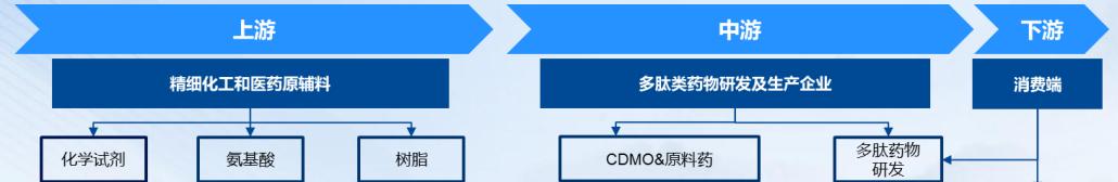 多肽药物产业链上游为原材料供应商,包括多肽合成试剂、氨基酸、固相载体树脂、填料、 固相合成仪等;产业链中游为多肽类药物研发及生产企业;产业链下游为销售终端,主要为药品批发商流向医疗机构,最终销售给患者。