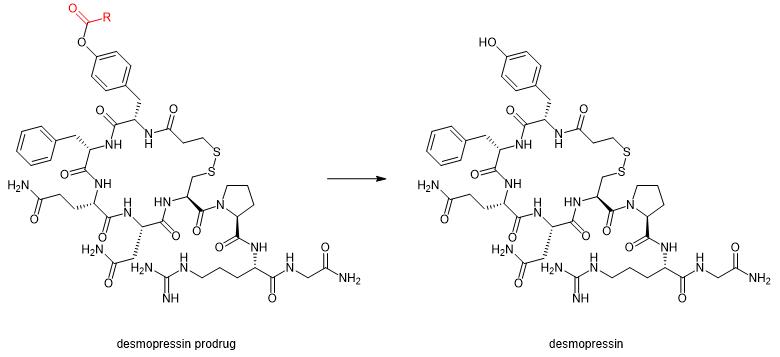 去氨加压素desmopressin是抗利尿激素加压素vasopressin的合成类似物,主要用于治疗夜尿症和尿崩症等泌尿系统类疾病。去氨加压素的酯类前体药物通过酪氨酸侧链的酚羟基脂化产生。这些衍生物通过人血浆中的酶水解定量地转化为去氨加压素(图1)。[1] 与去氨加压素相比,其新戊酸前体药物跨 Caco-2 细胞单层的转运明显更高效。