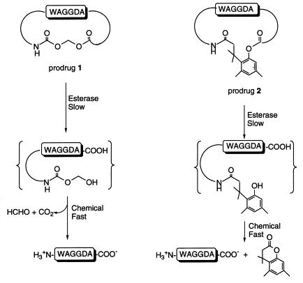 在一项研究中,利用H-Trp-Ala-Gly-Gly-Asp-Ala-OH的环肽前体药物对于环状酯的酶敏感性,研究者开发了将 N 端氨基与 C 端羧基通过酰氧基烷氧基连接的前体药物1和 3-(2'-羧基-4',6' -二甲基苯基)-3,3-二甲基丙酸连接的前体药物2。这些环状前体药物对酯酶代谢敏感(缓慢步骤),会在体内开环,并释放线性多肽药物。[3] 在 37 °C 的 pH 7.4 缓冲液中,两种环状前体药物均定量降解为线性六肽。在人血浆中,环状前体药物 1 和 2 的水解速度明显比在缓冲液中更快。与线性六肽相比,两种环肽前体药物在生物环境(例如人血)中的代谢稳定性明显更高,而且两种环肽前体药物在体外细胞培养模型下的肠粘膜透过率比线性肽增强了70倍。
