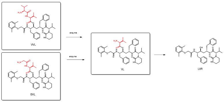 图5. 多肽前体药物VVL与GVL体内再生洛匹那韦 (LVR)的反应过程。