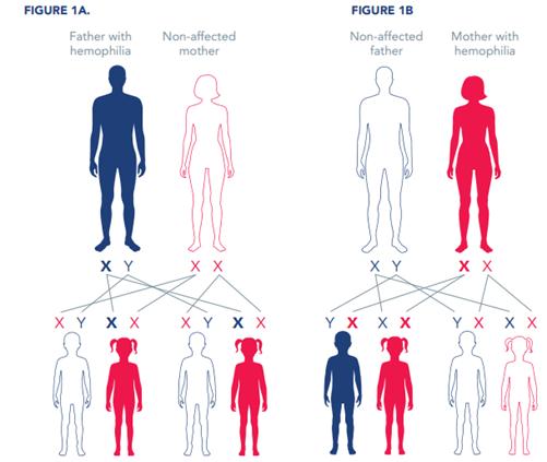 图3:血友病遗传方式(患有血友病的父亲会将其X染色体突变基因传给女儿而儿子不受影响;患有血友病的母亲会将其X染色体突变基因均等的传给女儿和儿子)