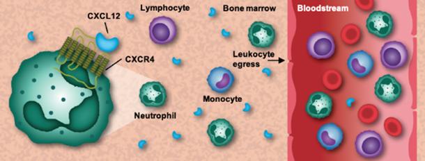 图3:CXCR4 通路调节白细胞从骨髓到外周血的动员