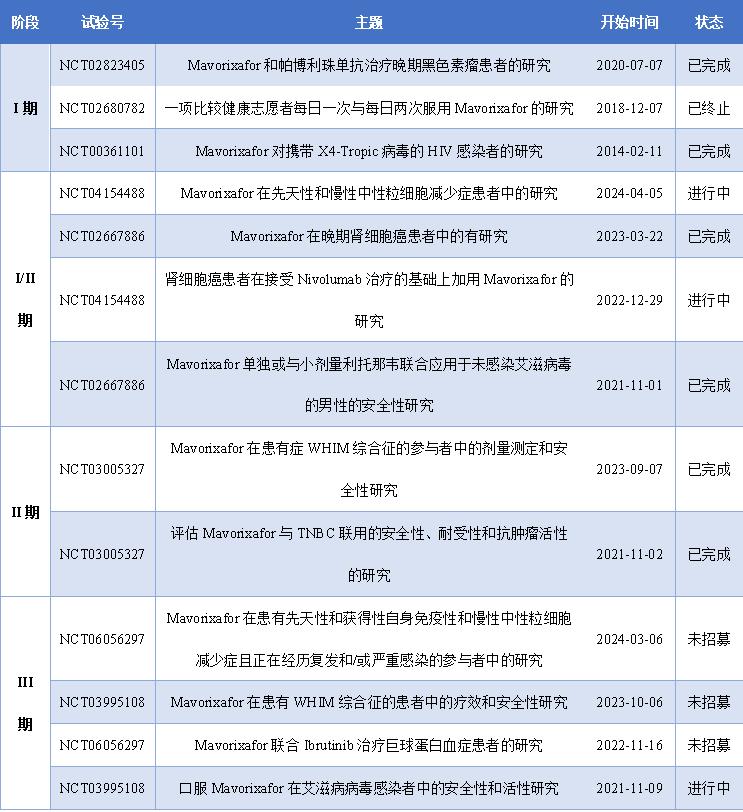 X4 Pharmaceuticals公司在得到了全球关键性4WHIM 3期临床试验结果的支持后,于2023年9月5日向FDA递交了Mavorixafor治疗WHIM综合征的新药上市申请(NDA),并于2023年10月31日宣布,FDA接受Mavorixafor治疗WHIM综合征的美国新药上市申请的优先审评。下图总结了Mavorixafor从研发到上市过程中所经历的临床研究。