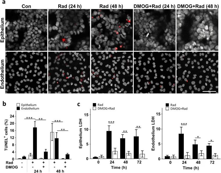 图2.辐射诱导的肠上皮细胞和血管内皮细胞凋亡和细胞毒性以及DMOG的放射保护作用。