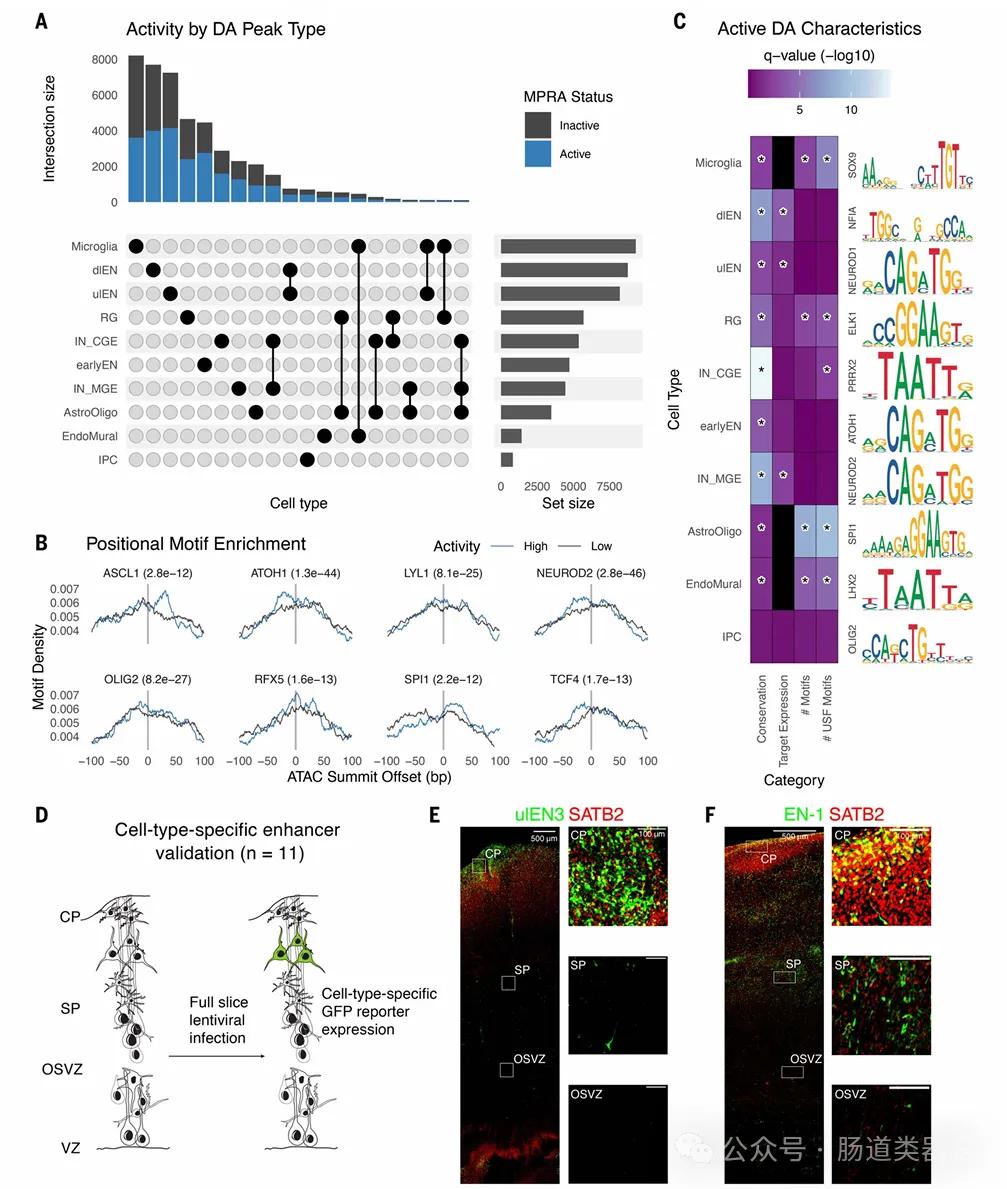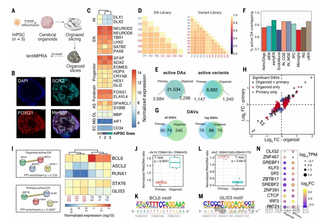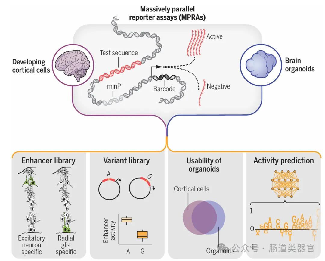 研究中使用了10周龄的大脑类器官,并通过免疫染色、RNA测序等方法验证了它们表达相关细胞类型标记物的表达。这些类器官被切割成薄片,并感染了包含候选调控序列的慢病毒lentiMPRA库。通过这种方式,研究者能够在类器官中评估这些序列的增强子活性,并与原代皮层细胞中的活性进行比较。